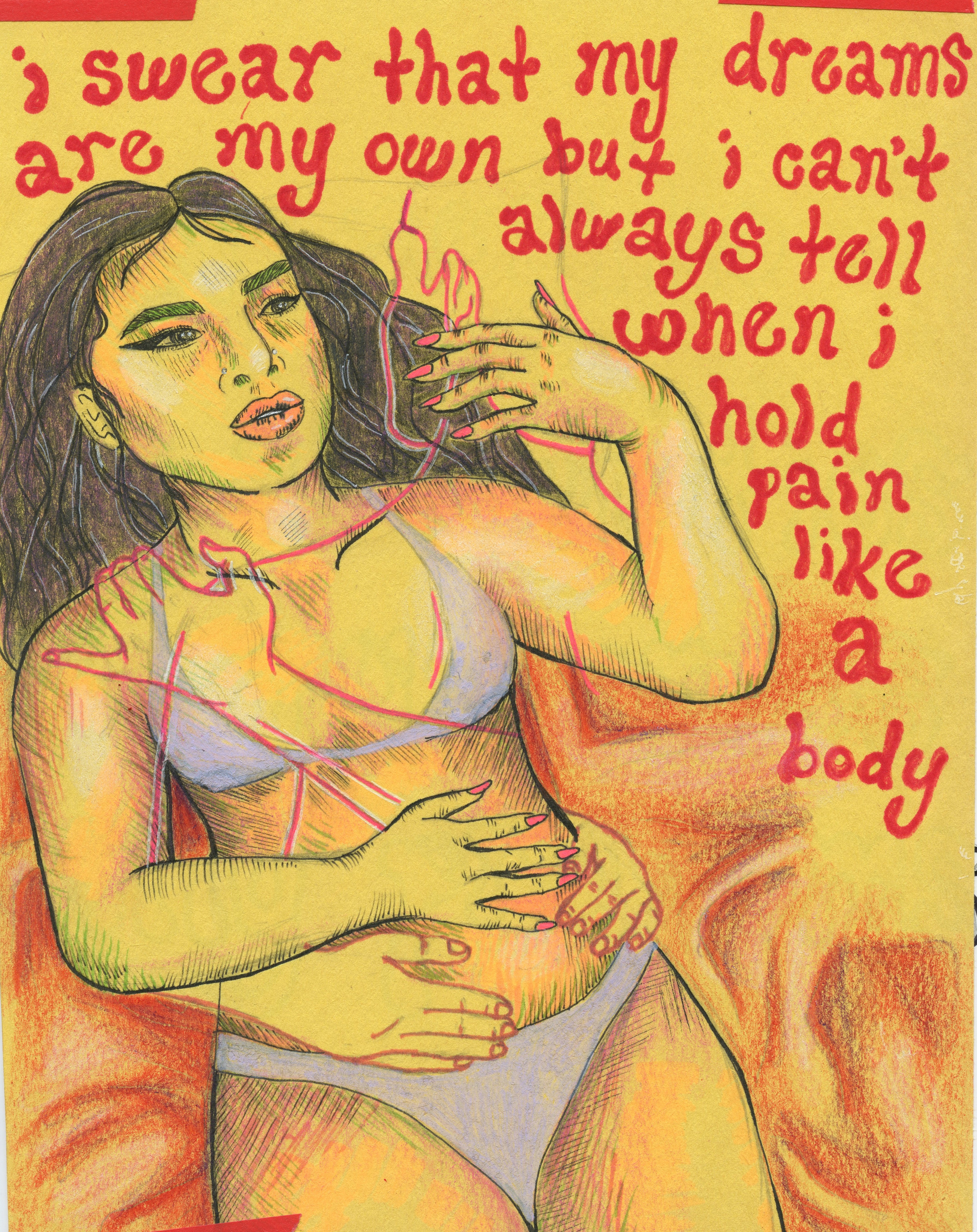 from left to right, “i swear that my dreams are my own but i can’t always tell when i hold pain like a body.”